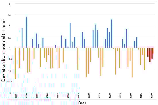 Deviation from the 1981–2010 normal of the average rainfall sum (mm) recorded from March 1 to October 30—corresponding to maize growing season—between 1955 and 2021. Orange bars: years drier than normal; blue bars: years wetter than normal; red bars: years of the survey, drier than normal.