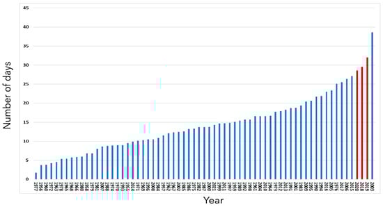 Number of days with temperatures above 30 °C between 1955 and 2021. Years are listed in order of increasing number of days. Red bars: the 3 years of the survey.