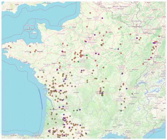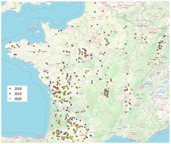 The localization of maize samples included in the study. Samples were collected at harvest time and their number and localization were adapted to be representative of French maize production. Red dots: 2018 samples (n = 195); blue dots: 2019 samples (n = 183); green dots: 2020 samples (n = 177).