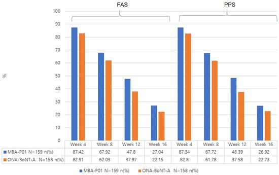 Efficacy was assessed using the full analysis set (FAS) and per-protocol set (PPS), while safety was evaluated using the safety set. For the primary efficacy endpoint, the difference in improvement rates (%) between the test and control groups was analyzed using a one-sided 97.5% confidence interval based on a normal approximation (Z-distribution). If the lower limit of the one-sided confidence interval was greater than −15%, it indicated that MBA-P01 was non-inferior to ONA-BoNT-A. For secondary efficacy endpoints, the test and control groups were compared using Pearson’s chi-square or Fisher’s exact tests.