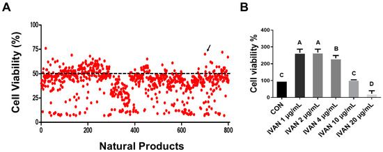 Effect of natural compounds on deoxynivalenol (DON)-induced cytotoxicity. WST-1 was applied to assess cell viability. (A) Cells were incubated with 2 μg/mL DON and 2 μg/mL natural compounds for 24 h. The dotted line indicates DON-caused cytotoxicity in cells. The arrow represents the cytotoxicity mitigation effect of IVAN in DON-treated cells. (B) Cells were exposed to various concentrations of IVAN (1, 2, 4, 10, and 20 μg/mL) for 24 h. Differences in upper-case letters mean mark differences (p < 0.05) among the treatments according to Duncan’s multiple range test. Error bars represent the standard error of analyses conducted in triplicate.