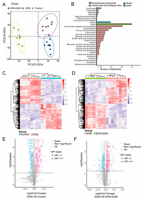 Figure 1. Metabolic analyses of cells upon SFN treatment and DON exposure. (A) PLS-DA for differential metabolites between different groups. (B) Classification of the identified metabolites. (C) Heatmap of cluster analysis of differential metabolites between DON and control group. (D) Heatmap of cluster analysis of differential metabolites between DON and SFN + DON group. The solid lines on the upper and left sides represent metabolites with the same expression pattern. (E) Volcano plot of differential metabolites between DON and control group. The dashed line represents the significance threshold. (F) Volcano plot of differential metabolites between DON and SFN + DON group. Control: cells without DON exposure; DON: cells exposed to 1 μg/mL DON; SFN + DON: cells treated with 2 μM SFN and 1 μg/mL DON.
