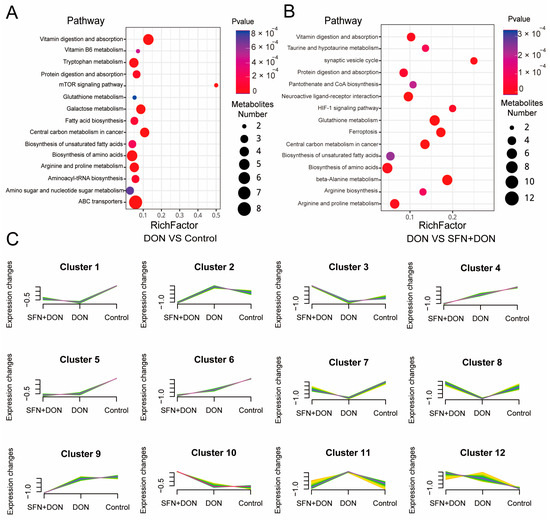 Figure 2. Analysis of different metabolites among different groups. (A) KEGG analysis of metabolites between DON and control group. (B) KEGG analysis of metabolites between DON and SFN + DON group. (C) Trend analysis of metabolites. Control: cells without DON exposure; DON: cells exposed to 1 μg/mL DON; SFN + DON: cells treated with 2 μM SFN and 1 μg/mL DON.
