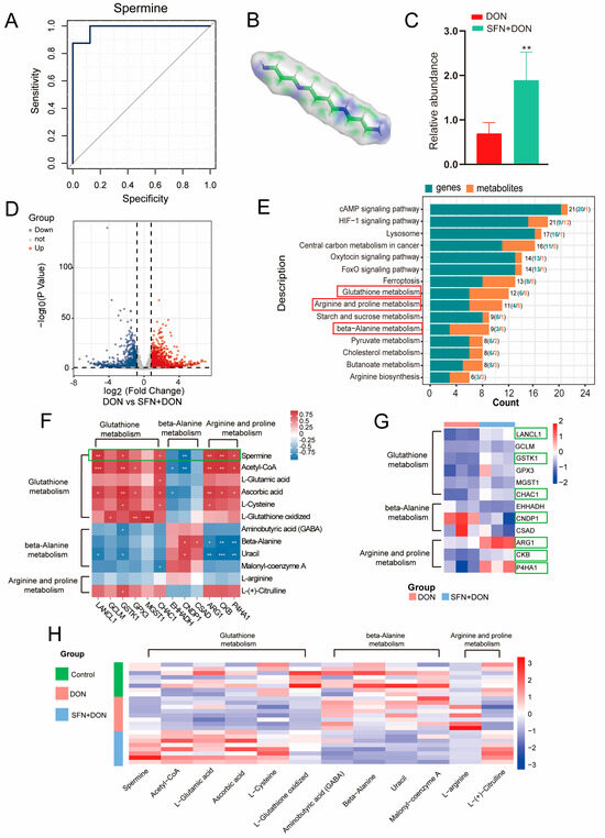 Figure 3. Comprehensive analysis of transcriptome and metabolome between DON and SFN + DON group. (A) ROC analysis. (B) The 3D structure of spermine. (C) Relative abundance of spermine in IPEC-J2 cells. DON: cells exposed to 1 μg/mL DON; SFN + DON: cells treated with 2 μM SFN and 1 μg/mL DON. (D) Volcano plot of DEGs between DON and SFN + DON group. The dashed line represents the significance threshold. (E) Comprehensive analysis of DEGs and differential metabolites between DON and SFN + DON group. The red box: pathways involved in spermine metabolism. (F) Correlations of DEGs and differential metabolites. * p < 0.05; ** p < 0.01; *** p < 0.001. (G) Heatmap of DEGs. The green box: genes significantly associated with spermine metabolism. (H) Heatmap of differential metabolites. Control: cells without DON exposure; DON: cells exposed to 1 μg/mL DON; SFN + DON: cells treated with 2 μM SFN and 1 μg/mL DON.
