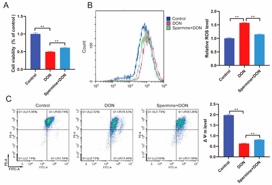 Figure 4. The role of spermine in DON-induced oxidative stress. (A) Cell viability detection upon spermine treatment and DON exposure. (B) ROS levels after spermine treatment during DON exposure. (C) Detection of ΔΨm level after spermine treatment and DON exposure. Control: cells without DON exposure; DON: cells exposed to 1 μg/mL DON; Spermine+DON: cells treated with 1 μM spermine and 1 μg/mL DON. Data are shown as mean ± SD, ** p < 0.01. n = 3 per group.