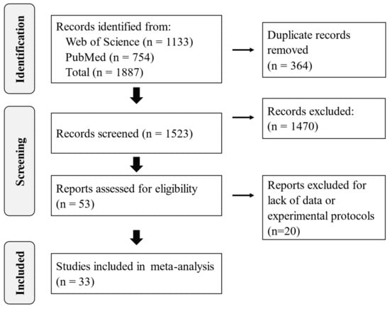 We systematically searched the Web of Science (Clarivate, London, UK) and PubMed (National Library of Medicine, National Institutes of Health, Bethesda, MD, USA) databases on 5 October 2023 using the following search phrase: ((AF OR AFB1 OR AFB2 OR AFG1 OR AFG2 OR AFL) AND (egg OR meat OR liver OR muscle OR gizzard OR organ OR kidney OR tissue OR residue) AND (poultry OR chicken OR layer OR broiler OR hen) AND feed). This search yielded 1887 articles, with the number reduced to 1523 when duplicates were excluded (Figure 1). Titles and abstracts were screened and 1470 articles were excluded because (i) the study did not involve broiler or layer chickens; (ii) the study did not measure both aflatoxins in the feed and residue in the tissues; (iii) the study was reported in a language other than English and could not be translated by Google translate; (iv) the study was outside the scope of this study, e.g., general and systematic reviews, book chapters, encyclopedias, case reports, and letters to the editor. We sourced, read, and critically analyzed the full texts of the remaining 53 articles, and retained 33 for further evaluation. These 33 articles all: (i) described peer-reviewed experimental research studies in which chickens (any age) were fed aflatoxin-contaminated feed, (ii) included data on aflatoxin residues in various tissues from chickens fed the aflatoxin-contaminated feed, and 3) specified the treatment protocols used.