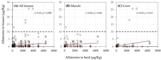 Relationship between the concentration of aflatoxin in chicken feed and aflatoxin residue in (A) all chicken tissues, (B) muscle, and (C) liver. The red lines are the line of best fit. The dotted lines indicate the global median limit of 10 µg/kg for total aflatoxins.