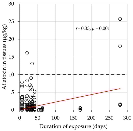 Relationship between the duration of exposure and the accumulation of aflatoxin residues in various tissues derived from chickens fed with aflatoxin-contaminated feed. The red line is the line of best fit. The dotted line indicates the global median limit of 10 µg/kg for total aflatoxins.