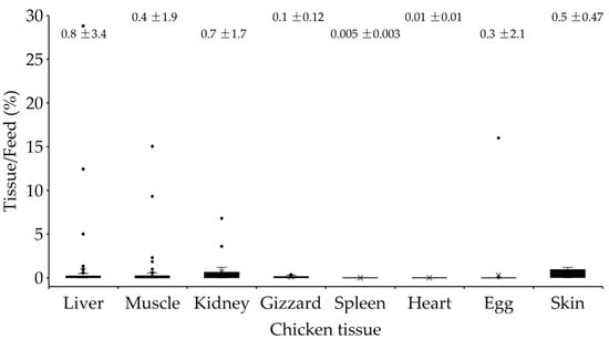 Aflatoxin buffering ability of chickens determined by the percent fold change (tissue: feed ratio) of aflatoxin concentration found in contaminated chicken feeds relative to the concentration of aflatoxin residues accumulated in the various tissues. Numbers above each column are mean ± standard deviation. Solid blocks in each column represent the 25th to 75th percentile range. “X” indicated the median value observed. Bullets are values > 75th percentile.