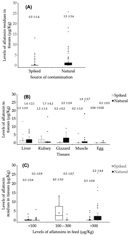 The effects of the source of aflatoxin contamination of feed—spiked versus natural contamination. Figures above each column are mean ± standard deviation. (A) Overall comparison of aflatoxin residuals in tissues from birds fed spiked or naturally contaminated feed. (B) Aflatoxin residue concentration in different tissues from birds fed spiked or naturally contaminated feed. (C) Overall aflatoxin residue concentration in various tissues of birds fed spiked or naturally contaminated feed stratified by the aflatoxin concentration level in the feed. Solid blocks in each column represent the 25th to 75th percentile range. “X” indicated the median value observed. Bullets are values > 75th percentile.