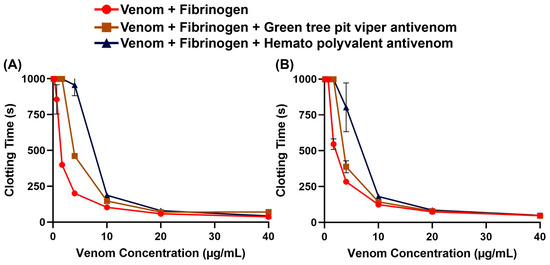 Antivenom effects on human fibrinogen clotting activity. Clotting time was measured until fibrinogen clotted or the maximum monitoring time of 999 s was reached. Data are presented as mean ± SD, n = 3; note that several error bars are absent because they are smaller than the icons. (A) Trimeresurus flavomaculatus; (B) Trimeresurus mcgregori.
