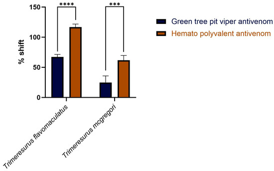 Percentage shift in the fibrinogen-clotting-time area under the curve in the presence of the antivenoms. This is calculated by the formula: [(AUC of venom + antivenom in fibrinogen/AUC of venom in fibrinogen) − 1] × 100. A percent shift value of 0 indicates no cross-neutralization, and a value greater than 0 indicates cross-neutralization by the antivenoms. Blue bars: Green Tree Pit Viper Antivenom; brown bars: Hemato Polyvalent Antivenom. Data are presented as mean ± SD, n = 3; asterisks indicate *** p = 0.0001, **** p < 0.0001.
