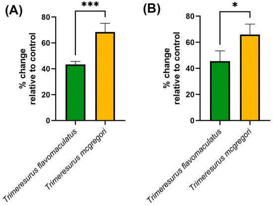 Clotting factor inhibition by the venom samples. Shown here are % change in fibrinogen clotting time relative to the negative control, where 0 means no inhibition, positive values mean inhibition of the respective clotting factor, and negative values imply enhancement of clotting factor activity. (A), fIXa; (B), fXa. Data are presented as mean ± SD, n = 4; asterisks indicate significant differences between the clotting factor inhibition values: *** = p < 0.001; * = p < 0.05.