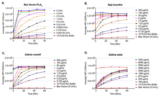 Time- and concentration-dependent phospholipase A2 activity. Mean fluorescence intensity (MFI) measurements of PLA2 activity from clinically relevant species. (A) Honeybee PLA2; (B) representative elapid Naja kaouthia; (C) viper Daboia russelii; and (D) box jellyfish Alatina alata. Each point represents the mean of five measurements and the error bars represent standard error of the mean (SEM).