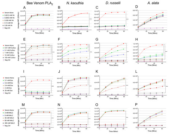 Inhibition of PLA2 activity. Inhibition of bee venom PLA2 (0.4 U/mL), N. kaouthia (0.4 µg/mL or 2 µg/mL), D. russelii (200 µg/mL), or A. alata (200 µg/mL) venom by (A–D) VA, varespladib, (E–H) Dox, doxycycline, (I–L) CuGluc, copper gluconate, and (M–P) NALC, N-acetyl-L-cysteine. Each curve represents the mean of three measurements and the error bars represent SEM. A 2-way ANOVA (mixed model) compared treatments and time points; a multiple comparisons Dunnett test was used to determine the significance between the venom alone and each treatment. Only p-values **** < 0.0001 that were significant across all time points are shown. For a complete list of p-values, see Supplementary Table S1. MFI = mean fluorescence intensity.