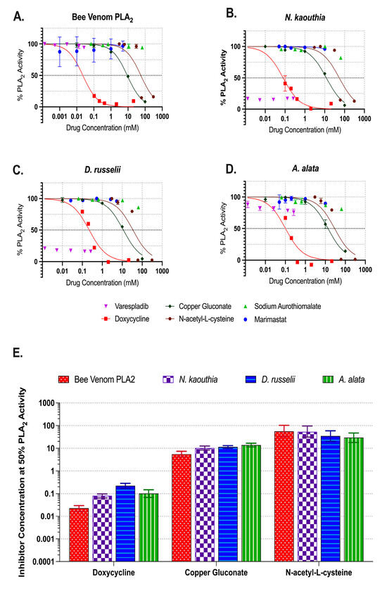 Summary of phospholipase A2 activity inhibition by small-molecule drugs. The % PLA2 activity was determined for selected inhibitors at 60 min in the presence of (A) bee venom PLA2 (0.4 U/mL), (B) N. kaouthia (0.4 ug/mL), (C) D. russelii (200 ug/mL), and (D) A. alata (200 ug/mL). Each point represents the mean of three replicates and the error bars represent SEM. (E) The inhibitor concentration required to reduce venom PLA2 activity by 50% was determined for doxycycline, copper gluconate, and n-acetyl-l-cysteine. Bar graphs represent the best fit inhibitor concentration (mM) value for a 50% reduction in PLA2 activity and error bars represent 95% confidence intervals.