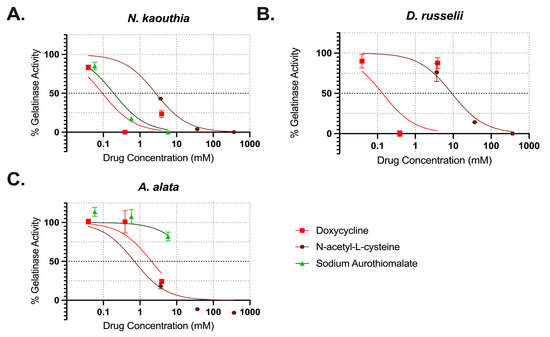 Three of the literature-reported MMP inhibitors were evaluated: doxycycline, sodium aurothiomalate, and N-acetyl-L-cysteine. The gelatinase activity of N. kaouthia, D. russelii, and A. alata at the 60 min time point was normalized and then plotted as a function of inhibitor concentrations (Figure 5). A non-linear regression curve was used to estimate the best-fit value for the concentrations required to reduce gelatinase activity by 50% for each inhibitor spanning the 0–100% activity range. Doxycycline reduced gelatinase activity by ~50% at 2.1 mM (95% CI 1.3–3.0%) for A. alata (Figure 5C) and completely inhibited both snake venoms below 1 mM (Figure 5A,B). Sodium aurothiomalate reduced N. kaouthia gelatinase activity by 50% at 0.2 mM (95% CI 0.16 to 0.23 mM), but did not effectively reduce A. alata or D. russelii venoms over the selected concentration range. At 9.2 (95% CI 7.2 to 11.7 mM), N-acetyl-L-cysteine reduced D. russelii activity by 50% and completely inhibited both N. kaouthia and A. alata gelatinase activity.