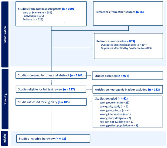 Electronic databases, including PubMed, Embase, and Web of Science, were systematically searched by a trained librarian (AW) to identify relevant studies. Two reviewers manually removed 122 papers on neurogenic bladder during the full-text review.