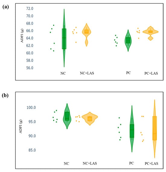 (a) Scatter and violin plot for average daily feed intake (ADFI) during 1–24 d of age. (b) Scatter and violin plot for ADFI during 1–42 d of age.