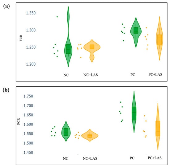 (a) Scatter and violin plot for feed conversion ratio (FCR) during 1–24 d of age. (b) Scatter and violin plot for FCR during 1–42 d of age.
