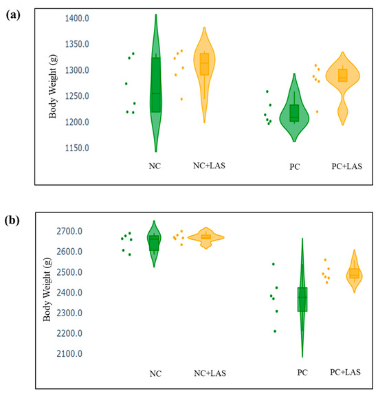(a) Scatter and violin plot of body weight (BW) measured at 24 d of age. (b) Scatter and violin plot of BW measured at 42 d of age.