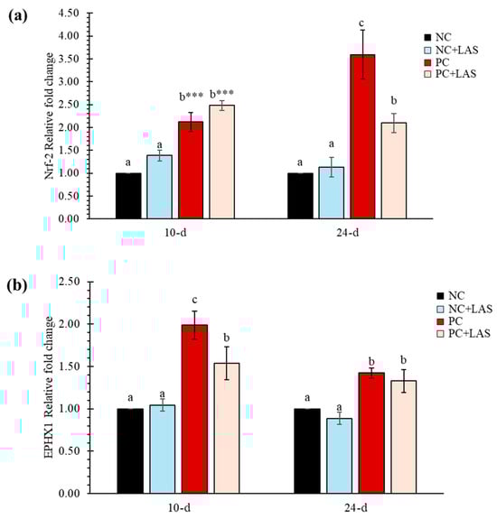 (a) The relative mRNA expression (2−ΔΔCt) of the Nrf-2 gene in hepatic tissues. The means represent 6 birds per treatment (n = 1 bird/replicate); bars with dissimilar superscripts in a row varied significantly; ANOVA P indicated by *** at p < 0.001. For 2−ΔΔCt-value of Nrf-2 gene: Main effect contamination: At 10 d p = 0.011, At 24 d p = 0.038; main effect LAS: At 10 d p = 0.001, At 24 d p = 0.001; contamination *LAS interaction: At 10 d p = 0.928, At 24 d p = 0.016. (b) The relative mRNA expression (2−ΔΔCt) of the EPHX1 gene in hepatic tissues. For the 2−ΔΔCt-value of the EPHX1 gene: main effect contamination: At 10 d p = 0.144, At 24 d p = 0.219; main effect LAS: At 10 d p = 0.001, At 24 d p = 0.001; contamination*LAS interaction: At 10 d p = 0.078, At 24 d p = 0.915.