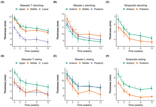Changes in muscle thickness over 12 weeks after botulinum toxin injection. (A–C) Muscle thickness measured during clenching. (D–F) Muscle thickness measured during resting. (A,D) Transverse sections of the masseter muscle (Masseter_T) measured in the upper (purple), middle (orange), and lower (green) regions. (B,E) Longitudinal sections of the masseter muscle (Masseter_L) measured at the anterior (green), middle (orange), and posterior (purple) regions. (C,F) Temporalis muscle thickness at the anterior (green) and posterior (orange) regions. Error bars indicate standard errors. A significant reduction in muscle thickness was observed following botulinum toxin injection, with a plateau effect occurring around week 4. Statistical significance: p < 0.05 *, p < 0.01 **, p < 0.001 ***.