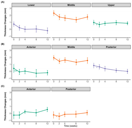 Changes in muscle thickness difference between clenching and resting over 12 weeks after botulinum toxin injection. (A) Transverse sections of the masseter at the upper (purple), middle (orange), and lower (green) regions. (B) Longitudinal sections of the masseter at the anterior (green), middle (orange), and posterior (purple) regions. (C) Temporalis muscle thickness at the anterior (green) and posterior (orange) regions. Data points show mean values with standard deviations. * p < 0.05, *** p < 0.001; ns, not significant.