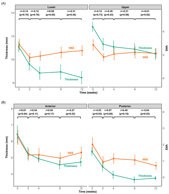 Changes in muscle thickness and pain intensity after BoNT-A injection in the masseter and temporalis muscles over 3 months. Time-course changes in muscle thickness (green line) and pain intensity (visual analog scale (VAS), orange line) for the masseter (A) and temporalis (B) muscles from baseline (0 weeks) to 12 weeks after BoNT-A injection. The left y-axis shows muscle thickness (mm), and the right y-axis shows the VAS score. Each data point represents the mean ± standard error of the mean (SEM). Pearson’s correlation coefficients (r) and p-values above the graphs indicate the correlations between the changes (Δ) in muscle thickness and VAS across consecutive intervals (0–2 weeks, 2–4 weeks, 4–8 weeks, and 8–12 weeks).