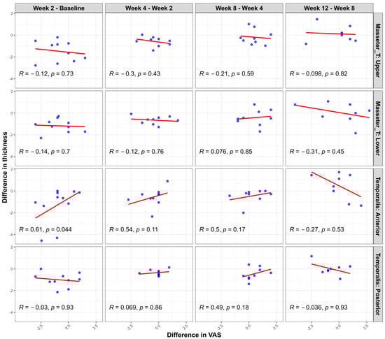 Correlation between changes in muscle thickness difference (clenching–rest) and pain intensity (VAS) changes at consecutive measurement intervals following BoNT-A injection. Scatter plots illustrate the relationship between interval changes in muscle thickness (measured during clenching versus rest conditions) and interval changes in pain intensity (VAS) in each muscle region (masseter upper, masseter lower, temporalis anterior, and temporalis posterior). Pearson’s correlation coefficients (R) and corresponding p-values are provided in each panel. A statistically significant correlation was observed only in the temporalis anterior region between the first and second evaluations (R = 0.65, p = 0.03). The other areas and intervals demonstrated no significant correlations.