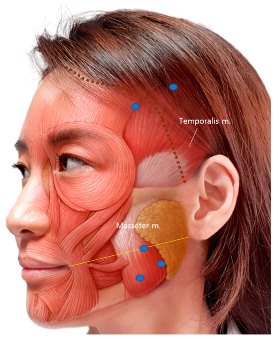 BoNT-A injection sites of the temporalis and masseter muscles. Three injections on the masseter and two injections on the temporalis were performed. The yellow line is a reference line connecting the cheilion to otobasion inferius. The blue dots indicate the injection points, and the dotted brown line indicates the actual hairline.