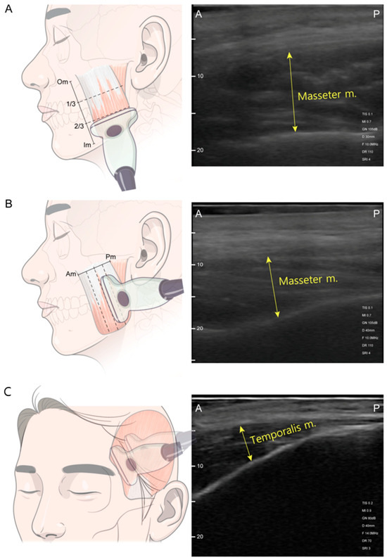 This study included 68 patients who visited Gangdong Kyung Hee Dental Hospital for TMD treatment using botulinum toxin between January 2022 and August 2024. All patients underwent a thorough examination and diagnosis by two TMD specialists with more than 10 years of clinical experience. The patients were diagnosed with myogenic TMD of the masticatory muscles according to the DC/TMD criteria. Of the 68 patients, patients with VAS scores and US images at follow-up (2 weeks after injection, 1 month after injection, 2 months after injection, and 3 months after injection) were included. Patient inclusion criteria were (1) age over 18 years old, (2) myalgia of the masseter and/or temporalis muscle, (3) no history of TMJ sound, (4) no malocclusion, and (5) no mouth opening limitation. Demographics such as age, sex, maximum mouth opening, and general conditions were investigated.