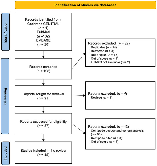 A total of 123 potentially relevant studies were initially identified. Fourteen duplicates were removed, and 32 were excluded after screening titles and abstracts. Upon full-text review, 42 studies were further excluded because they were either not in English, reviews, overviews, or editorials, studies focusing on the biology and biodiversity of centipedes themselves or biological analysis of its venoms, or studies on accidental centipede bites. Consequently, 45 studies were included in the final review (Figure 1, Table 1). The PRISMA flow chart documents each step of the selection process, and Supplementary Table S1 provides further details on the studies included.