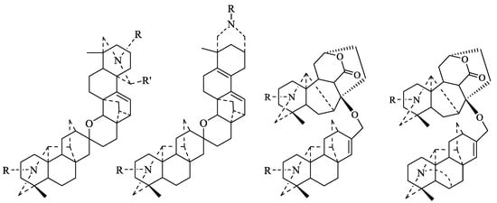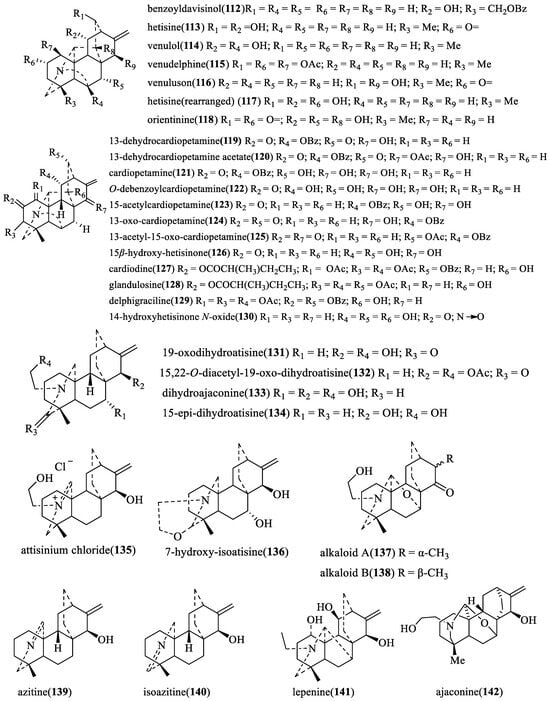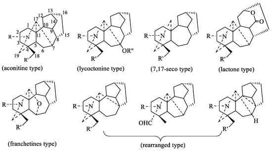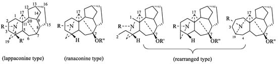 From the viewpoint of their biogenesis, diterpenoid alkaloids are derived from the amination of tetracyclic or pentacyclic diterpenoids in nature. As far as we know, more than 1500 natural diterpenoid alkaloids have been reported to date []. In 2020, Zhao and coworkers wrote a review on the structural diversity, bioactivities, and biosynthesis of natural DAs from 2009 to 2018, in which DAs were divided into four categories, C18-, C19-, C20-, and bis-diterpenoid categories []. The largest group is C19-diterpenoid alkaloids (Figure 1), which generally have multiple oxygen-containing substitutions and can be further divided into aconitine-type, lycoctonine-type, seco-type, and lactone-type, based on the carbon skeleton and substituents at specific positions. The C18-diterpenoid alkaloids, which constitute a small group within the diterpenoid alkaloids, can be divided into lappaconine-type and ranaconine-type according to the presence of oxygen-containing substitution at the C-7 position (Figure 2). C20-diterpenoid alkaloids have many kinds, and their molecular skeleton is composed of 20 carbon atoms, which generally contain exocyclic double bonds (Figure 3). The skeletal types of the C20-diterpenoid alkaloids are extremely complex compared with those of C18- and C19-diterpenoid alkaloids []. Bis-diterpenoid alkaloids are formed by condensation of two C20-diterpenoid alkaloids, or of one each of the C19- and C20- diterpenoid alkaloids (Figure 4).