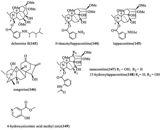 In 2020, the contact toxicity of three C18-diterpenoid alkaloids and 4-hydroxynicotinic acid methyl ester (149), isolated from Aconitum anthoroideum DC., against Nilaparvata lugens Stal and Sogatella furcifera Horvath was tested []. The results showed that the four compounds had significant contact activity, and ranaconitine (147) exhibited the strongest insecticidal activity with the LD50 of 0.26 μg/insect and 0.25 μg/insect after 48 h treatment, respectively.