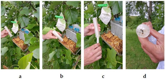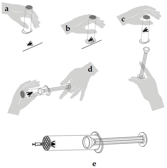 The capture process of V. velutina was conducted at one of our four designated collection points. To capture the hornet, the CCh of the StingReady device is slowly brought close to the insect while it remains occupied at the bait station (Figure 9a). Once the chamber is properly positioned, it is used to swiftly enclose the hornet, allowing it to remain calm and naturally move upward towards the mesh end of the chamber (Figure 9b). In the next step, the GC is gently introduced into the chamber while both hands stabilize the device, ensuring the hornet is securely confined without harm (Figure 9c). Finally, the complete StingReady device is held securely, with the hornet safely contained within, ready for transport (Figure 9d). A video supplement demonstrating the entire capture process is included in this study to provide a detailed visual guide for replicating the methodology (Supplementary Video S1). After capture, the insects were kept in darkness until the time of the SCT to minimize stress and activity. During this period, they were fed ad libitum using one 2.5 mL syringe filled with a honey–water solution (80% honey, 20% water) (Figure 9e). The tip of the syringe was carefully inserted through the mesh of the Cch, allowing the insect to access food without being disturbed.