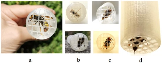 Close-up views of insect species captured within the StingReady device. (a) A Vespa velutina queen (gyne) in containment. (b) Top: Polistes spp. with a modified chamber mesh size of 3 mm; bottom: Bombus spp. specimen. (c) Top: Vespa velutina male; bottom: Vespa velutina worker. (d) Detail of the mesh showing the insect’s stinger and part of the abdomen extending through, as seen with a Vespa velutina worker, allowing safe sting access to the skin. Photo author: X. Feás.