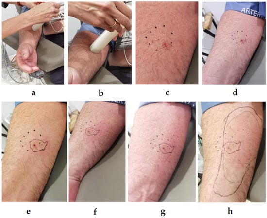 - Observation of the sting reaction: Once the patient feels the sting, the hornet is kept in position, confined against the mesh, for, at least, 15 s to ensure a complete sting. The skin reaction is marked and closely observed, and any immediate signs of allergic response are noted (Figure 10c).