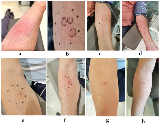 Progression of sting reactions from Vespa velutina stings in different patients. (a) Patient with localized reaction immediately after a single sting. (b) Patient with three distinct stings. (c) Initial sting reaction in a patient directly post-sting, and (d) after 1 h. (e) Immediate reaction in a different patient, (f) 8 min post-sting, (g) 12 days post-sting, and (h) 19 days post-sting. Photo author: X. Feás.