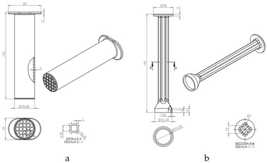 Cross-sectional and perspective views of the StingReady device: (a) the collection chamber (Cch), illustrating the device dimensions and detailed structure, including a close-up of the mesh securing feature; (b) side and perspective views of the gliding component (GC), highlighting the containment area at the terminal end designed to safely hold the insect in place for a controlled sting.
