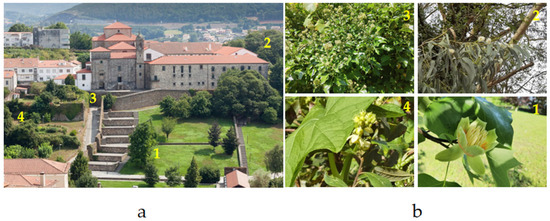 Collection points for Vespa velutina and other hymenopterans in Belvís Park. The left side of the figure (a) shows part of Parque de Belvís with numbered collection sites (1–4) for insect sampling. The right side (b) displays images of the specific flowering plants associated with each point: (1) Liriodendron tulipifera (tulip tree), (2) Eucalyptus spp. (eucalyptus), (3) Hedera helix (ivy), and (4) Sechium edule (chayote). Each site corresponds to periods of plant flowering which attract hymenopterans. Photo Author: X. Feás.