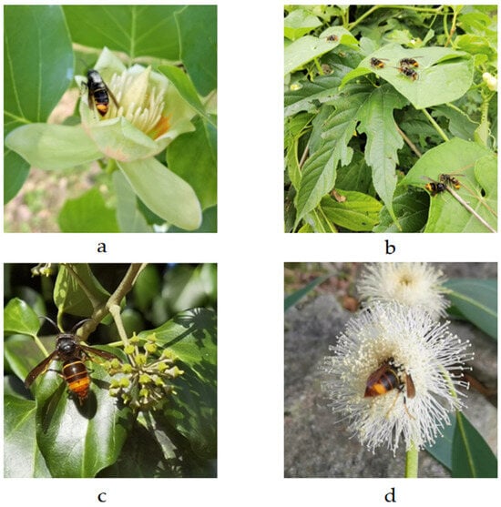 Vespa velutina specimens observed on four different flowering plant species within Belvís Park, each corresponding to a specific stage or caste of the species. (a) Founder queen on Liriodendron tulipifera (tulip tree); (b) workers on Sechium edule (chayote); (c) male on Hedera helix (common ivy); and (d) gyne on Eucalyptus sp. Photo Author: X. Feás.
