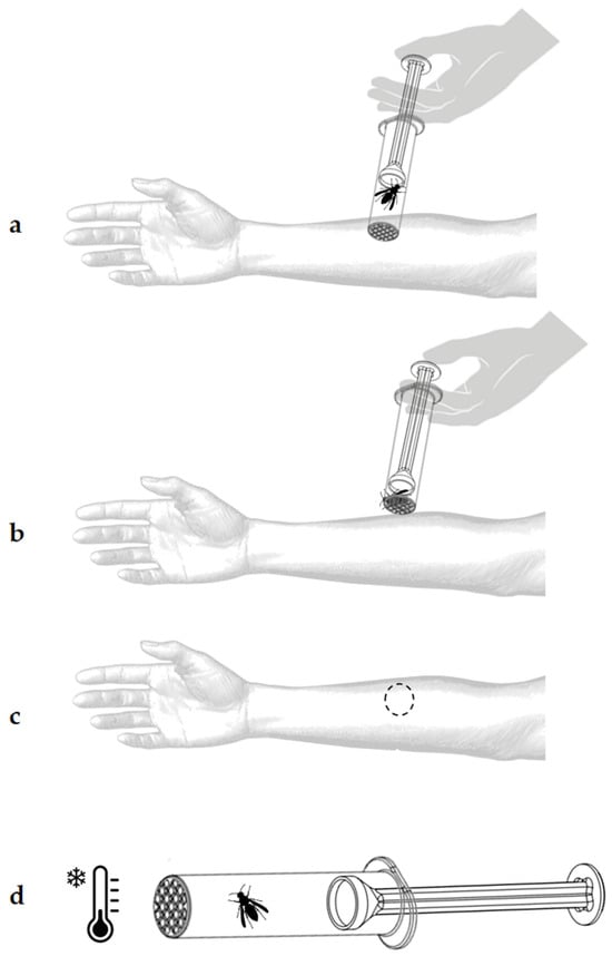 Procedure for using the StingReady device to induce a controlled sting. (a) The initial placement of the device in contact with the patient’s skin. (b) The activation of the gliding mechanism to position the insect for stinging; the device is held in place for 15 s after the initial sting occurs. (c) Marking the area after removing the device to document the sting location. (d) Euthanasia of the insect by placing the device in a freezer at −18 °C for five minutes.