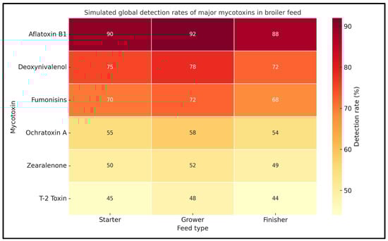Simulated global detection rates of major mycotoxins in broiler feed.