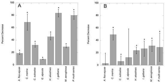 Percent decrease in chlorophyll after exposure to C7X1 at 7000 ppm for 24 h (A) and percent decrease in cell counts after exposure (B). Error bars are standard deviations from six biological replicates for Panel A and three biological replicates for Panel B. Statistically significant decreases (Student’s t-test, p < 0.05) are indicated with asterisks (*).