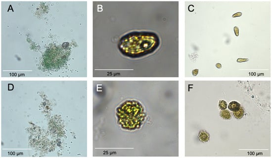 Micrographs of representative algae exposed to 7000 ppm C7X1 for 24 h. (A) M. aeruginosa control; (B) H. akashiwo control; (C) C. marina control. (D) M. aeruginosa treated with algaecide; (E) H. akashiwo treated with algaecide; (F) C. marina treated with algaecide. Each pair of micrographs was imaged with the same magnification and illumination.