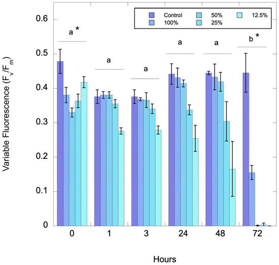 Variable fluorescence (Fv/Fm) from Pinto Lake that was serially diluted and exposed to 1000 ppm C7X1, with sampling conducted from 0 to 72 h. Error bars are the standard deviation of three biological replicates. There were significant differences for the 72-h timepoint (b) versus all other timepoints (a) and between the Control and 12.5% dilution (*).
