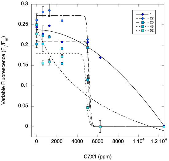 Figure 4 shows an M. aeruginosa culture treated with C7X1 at 0 (control), 625, 1250, 2500, 5000, 6250, and 12,500 ppm and measured sequentially at 0, 1, 22, 25, 48, and 72 h. The IC50 values steadily decrease with time, ranging from 7341 ppm (0 h) to 3466 ppm (48 h) ppm C7X1. There also appeared to be a threshold response with a rapid decrease in Fv/Fm above 2500 ppm. Based on these results, subsequent tests typically used 24-h exposure for IC50 values (Table 2) for intercomparison of the results.