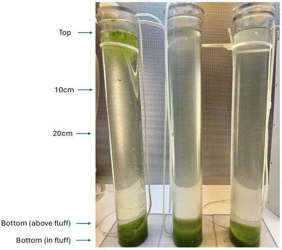 The columns were sampled after 1.5 h and resampled after 24 and 48 h at the top, 10 cm, 20 cm, immediately above the biomass at the bottom of the column and from within the bottom layer (Figure 5). Samples were analyzed for Fv/Fm and rETR curves. At the termination of the experiment, the Control column was treated with 5000 ppm C7X1 and mixed, replicating Column 3.