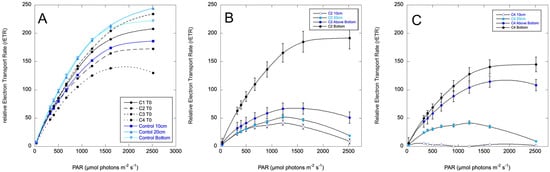Relative Electron Transport Rate (rETR) curves for the columns prior to treatment (A), Column 2 (C2), which was mixed and then treated by spraying C71X at the top (B), and Column 4 (C4), which was sprayed at the top with no mixing (C). Depth sampling for C2 and C3 is as indicated in Figure 4. Error bars are standard deviations for three biological replicates.